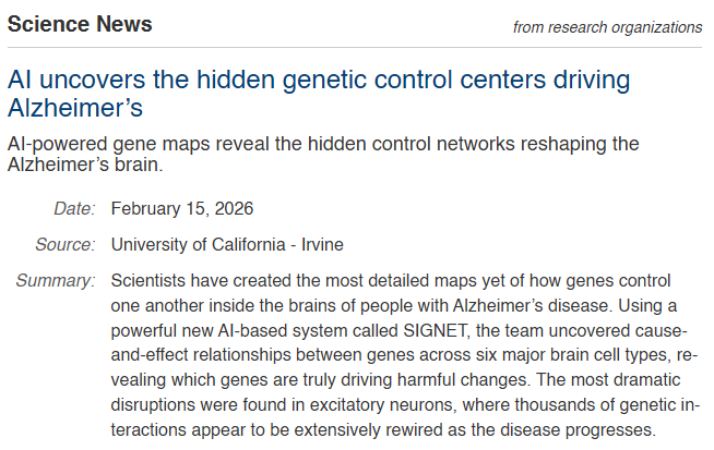 Mapas genéticos impulsados por IA han revelado las redes de control ocultas que transforman el cerebro afectado por el Alzheimer, gracias a una plataforma de IA llamada SIGNET. La IA está llena de cosas buenas, solo falta más gente interesada en esa dirección.